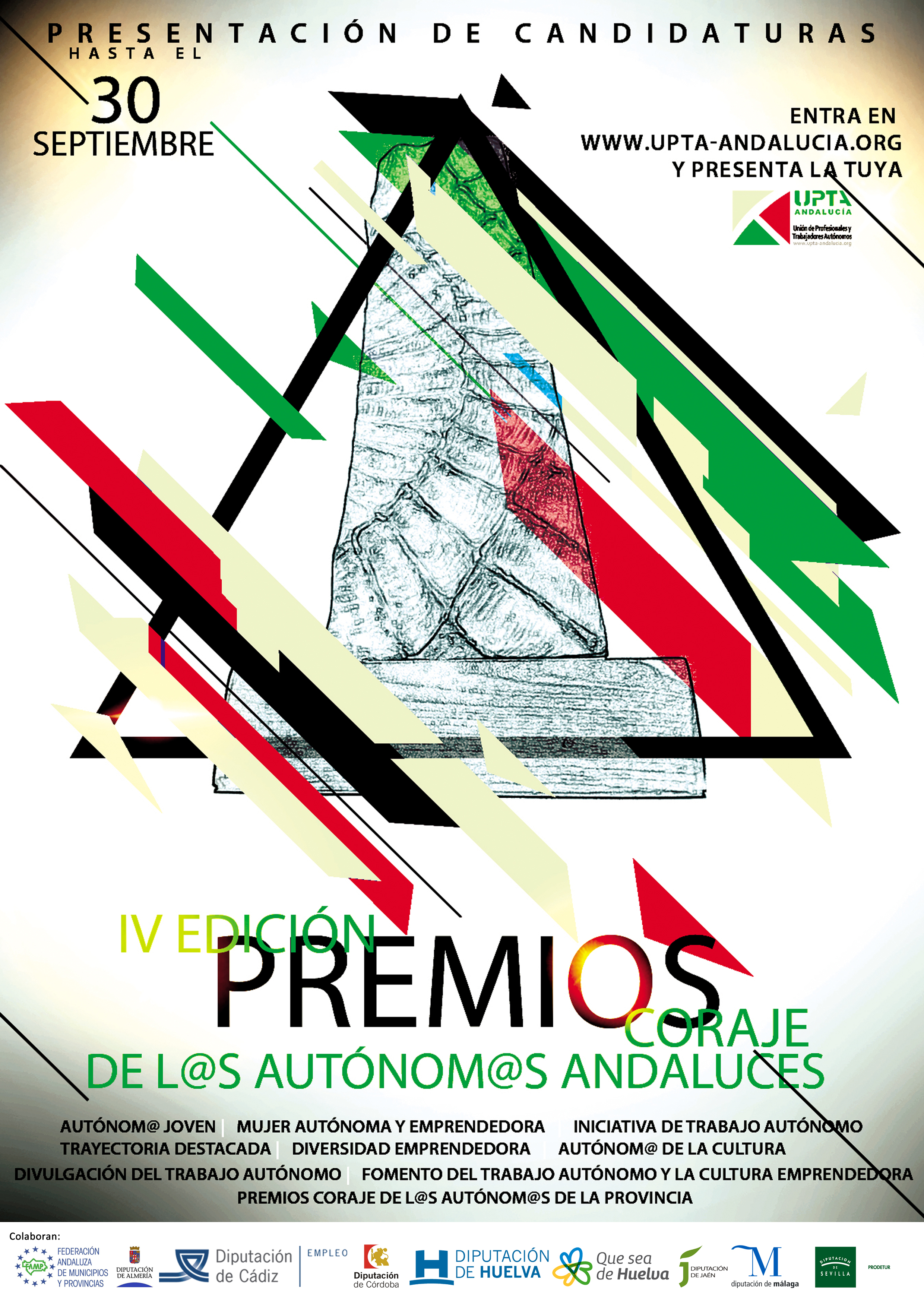 UPTA Andalucía convoca la IV Edición de los Premios «Coraje de l@s autónom@s andaluces» para seguir visibilizando, promocionando y reconociendo a los trabajadores y trabajadoras autónomos. Hasta el 30 de septiembre de 2019 permanecerá abierto el plazo de presentación de candidaturas destinadas a premiar en el ámbito de la Comunidad Autónoma de Andalucía a: