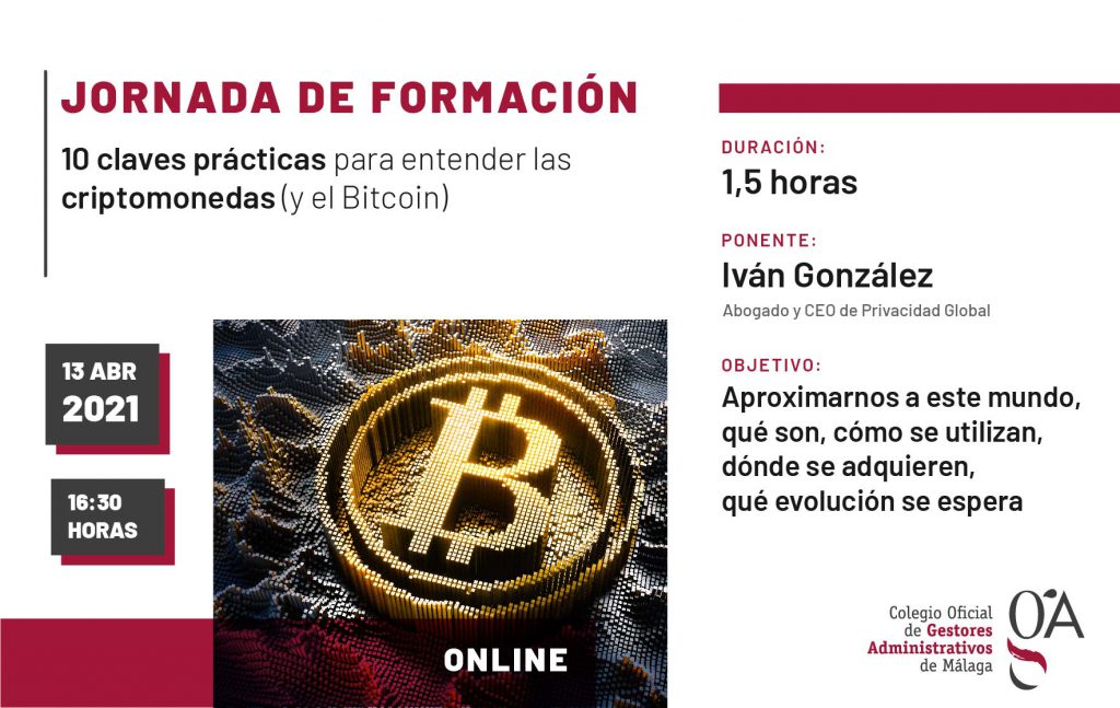 ¿Quieres estar al día? No te pierdas la jornada de formación que el Colegio ha preparado para ti. En esta ocasión hablaremos sobre las criptomonedas (bitcoin) de la mano de un destacado experto: Iván González, abogado y Ceo de Privacidad Global. Te esperamos.