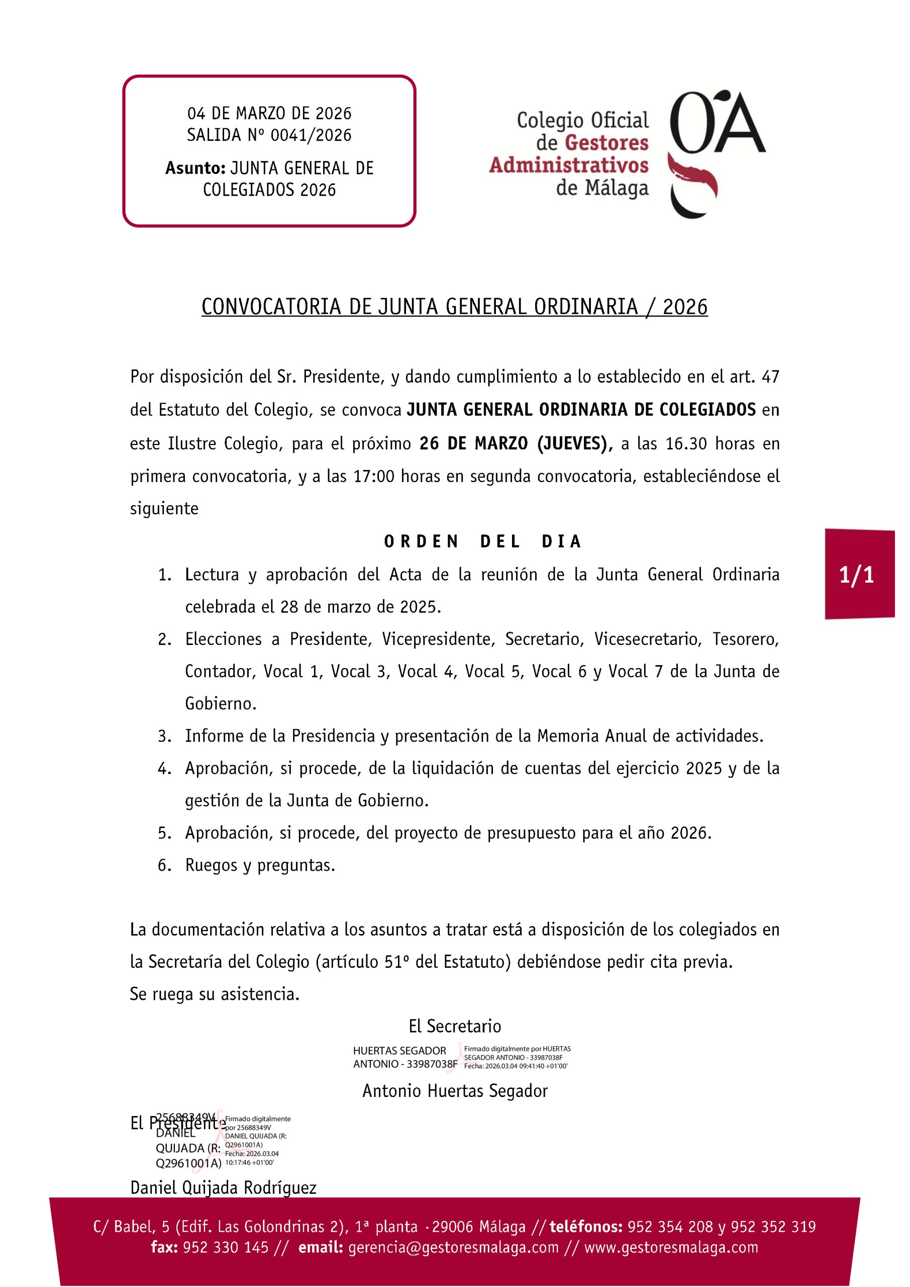 El Ilustre Colegio de Gestores Administrativos de Málaga convoca Junta General Ordinaria de Colegiados, que tendrá lugar el próximo 26 de marzo (jueves) en la sede colegial.